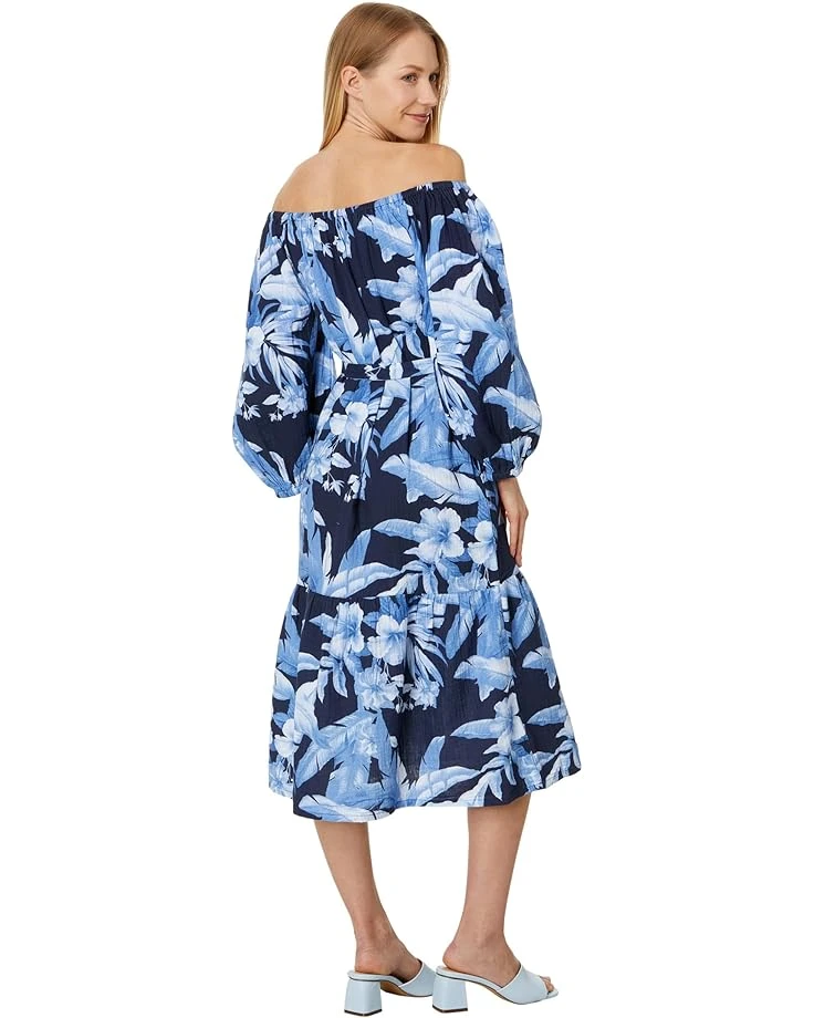 - Groove to your delightful holiday tunes wearing the Tommy Bahama® Daybreak Hibiscus Ots Dress. It features an off-shoulder neckline with flexible elasticized detail, long puffy sleeves, removable self-fabric belt, two on-seam side pockets, and tiered hem designed in a flowy A-line silhouette.