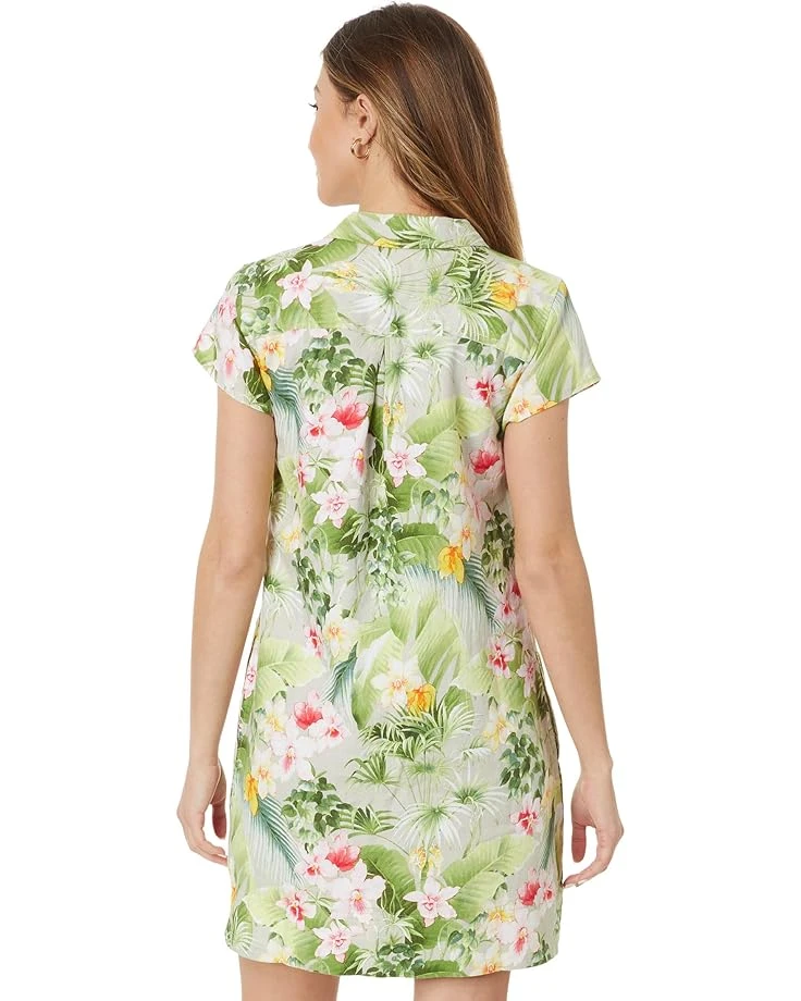 - Elevate your style with the Tommy Bahama® Flora Riviera SS Dress − where comfort meets sophistication. Embrace the allure of the feminine botanical print in this new short sleeve silhouette. Enjoy the lightweight two palms printed linen, adorned with a notch collar and flattering V-neckline. Lined with pockets, it’s fashionable with functionable.