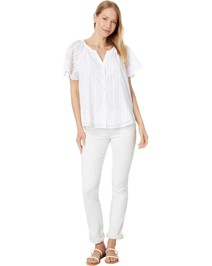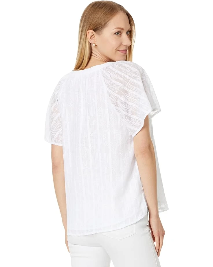 - Add a vintage flair to your look styling your denim with the Tommy Bahama® Illusion Frond SS Top, that comes in an allover stripe dobby burnout print. The top features a split V-neckline, full front-button closure, short flutter sleeves, and a curved hem.