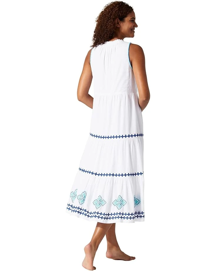 - Ace the casual style game and get loads of compliments for your easy-going style wearing Tommy Bahama® Shell Beach Tiered Maxi Dress. The lightweight dress features a split V-neckline with beaded tassels, sleevelss design, two side pockets, embroidered detail on the neck, and tiered skirt that is intended to hit below the knees.
