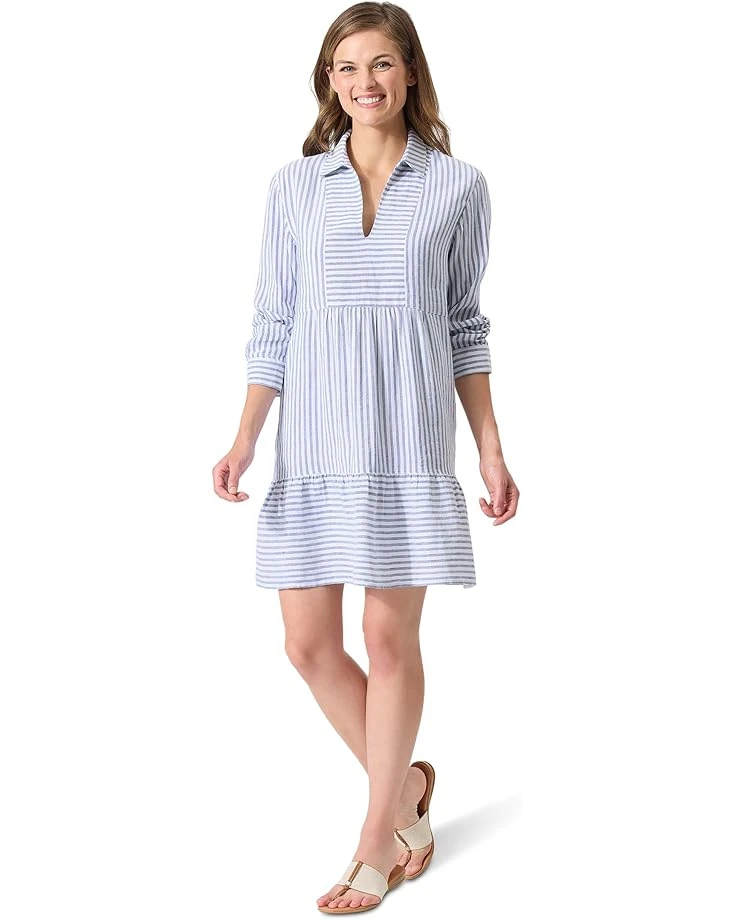 - Live as you want and move as you can wearing the Tommy Bahama® Stamped Lucia Stampedripe Collar Dress. It features a pull-on style, collared V-neckline, and long sleeves with button cuffs. Allover stripes with ruffled hemline give a trendy look to this relaxed-fit dress, that will stay in style for long.