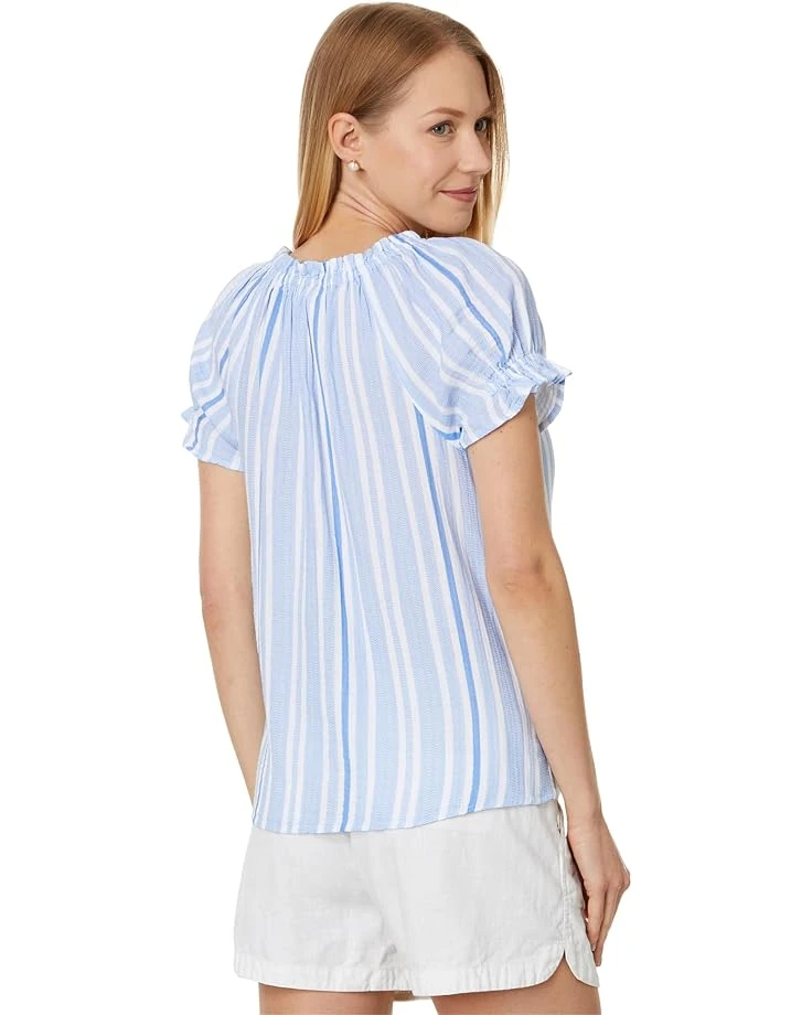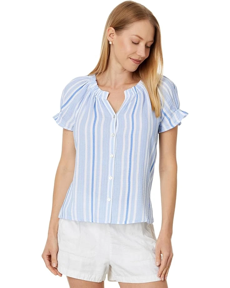- Break the mold with your stylish stance wearing Tommy Bahama® Villa Solstice Short Sleeve Top. It features a split V-neckline with ruffle collar, short sleeves, buttoned front closure, and allover stripe print.